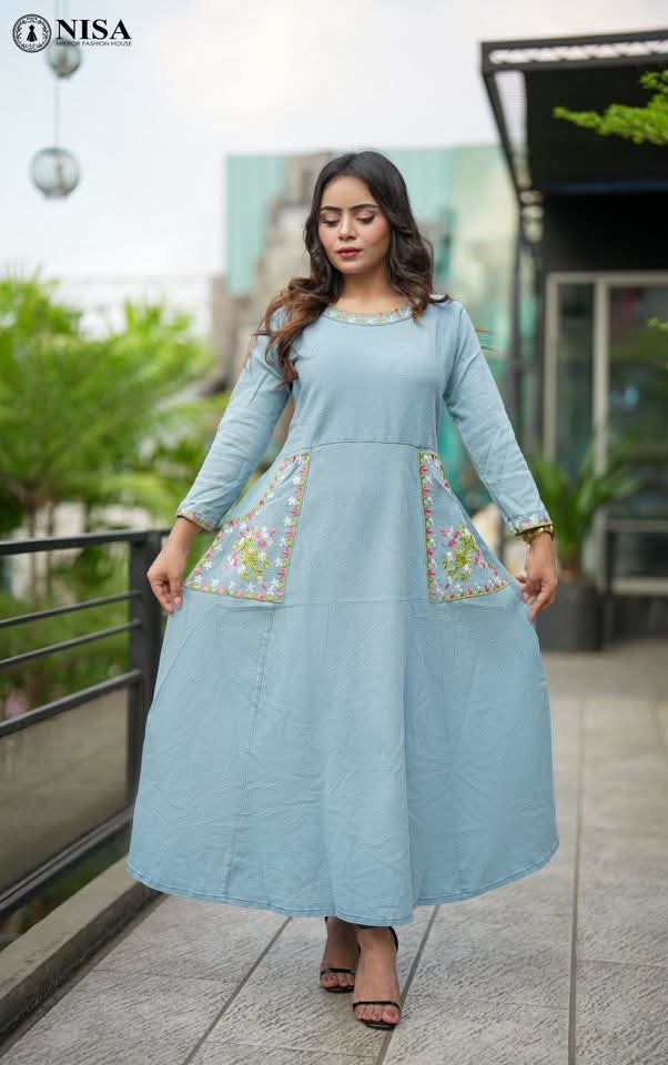 Nisa Fashion House presents the Premium Denim Gown — designed for comfort, durability, and standout style. Featuring a sleek fit, elegant stitching, and breathable denim fabric, this gown ensures all-day comfort while keeping you effortlessly stylish. Perfect for college, outings, gatherings, or everyday wear.